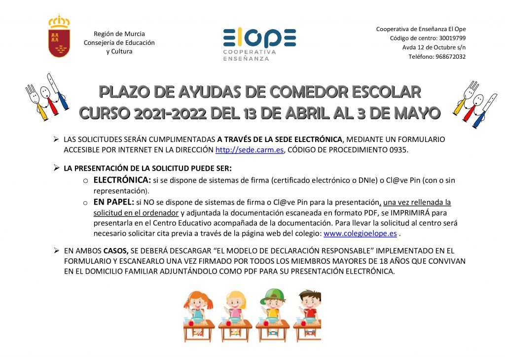 El plazo de solicitud de Ayudas de Comedor Escolar para el próximo curso 2021-2022 será desde el 13 de abril hasta el 3 de mayo. TODAS las solicitudes deberán cumplimentarse mediante un formulario accesible por INTERNET en la dirección http://sede.carm.es, código de procedimiento 0935. A continuación, os dejamos un documento en el que se indican […]
