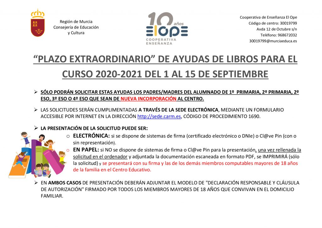 PLAZO EXTRAORDINARIO AYUDAS LIBROS CURSO 2020-2021