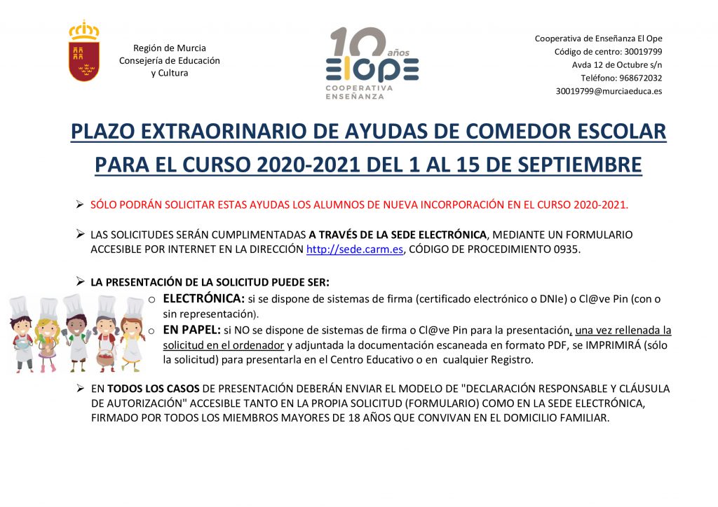 PLAZO EXTRAORDINARIO AYUDAS COMEDOR CURSO 2020-2021