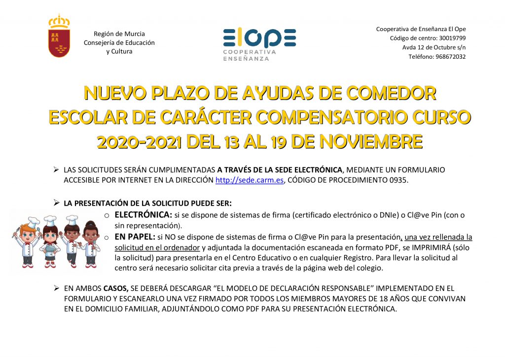 NUEVO PLAZO DE AYUDAS DE COMEDOR ESCOLAR DE CARÁCTER COMPENSATORIO CURSO 2020-2021