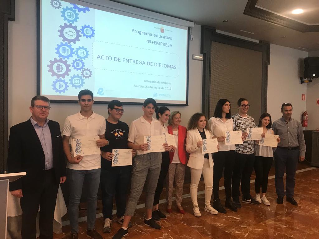 Nuestros alumnos de 4º de ESO asistieron el pasado jueves a la entrega de diplomas del Programa 4º + Empresa, en el que participaron más de 500 alumnos que realizaron estancias formativas en empresas. El acto de clausura tuvo lugar en el Hotel León del Balneario de Archena.