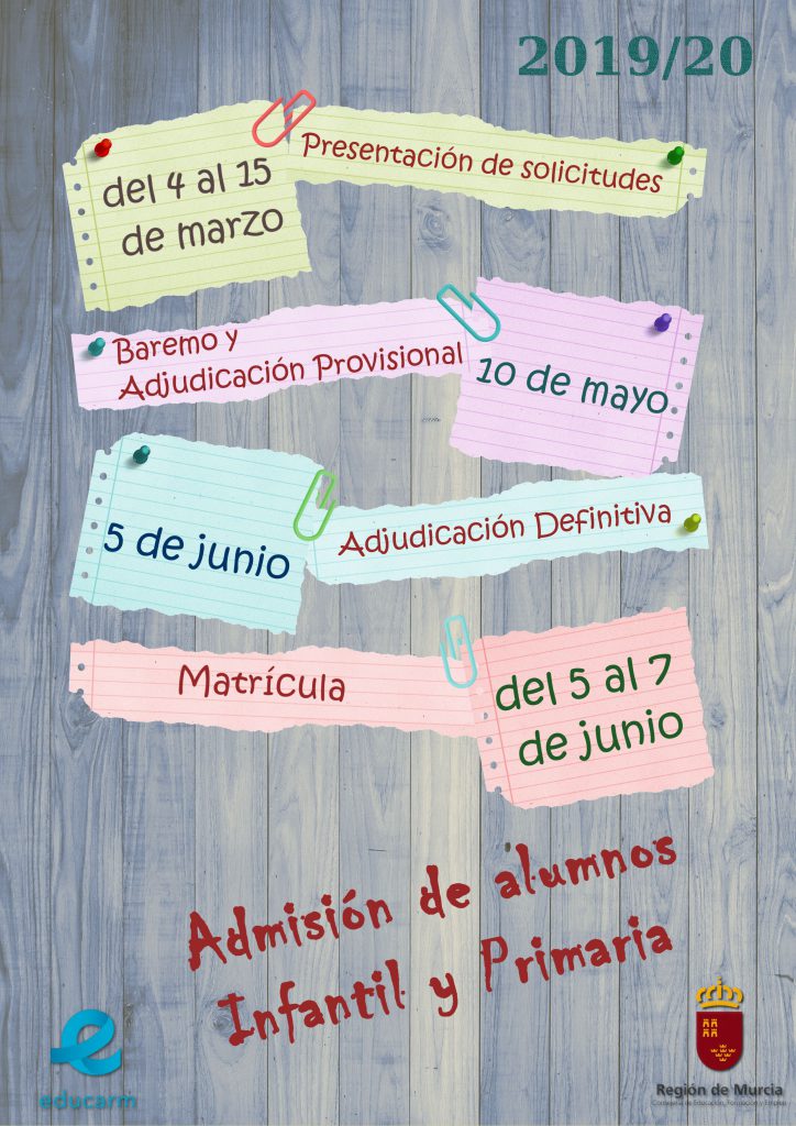 El periodo de admisión de alumnos de Infantil, Primaria, Secundaria y Bachillerato será desde el lunes 4 de marzo hasta el viernes 15 de marzo. Para más información, visiten la página web: www.educarm.es o nuestro centro.