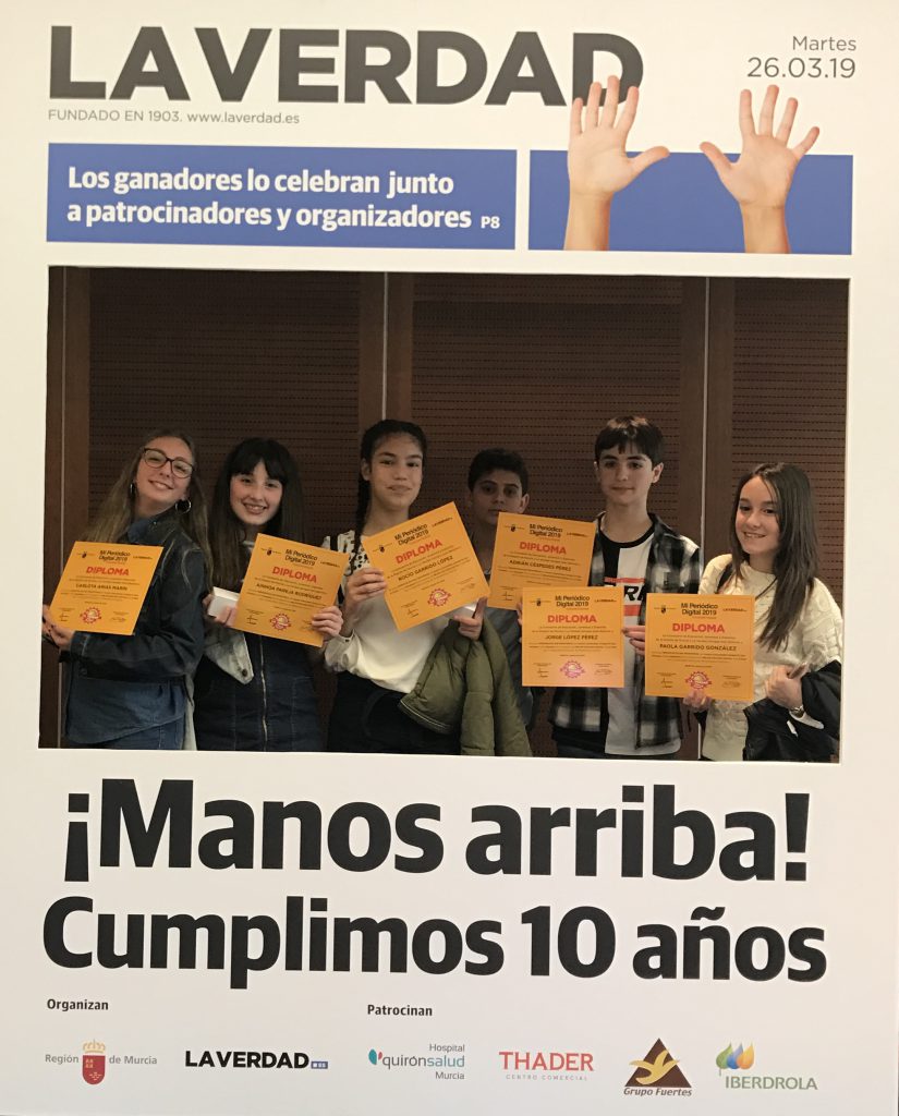 Hoy se ha celebrado en el Hotel Nelva de Murcia la entrega de premios de la X Edición del concurso escolar » Mi Periódico Digital». El grupo «LOS PERIODISTAS SIN FRONTERAS» han resultado los ganadores a la mejor Edición Digital de 1º y 2º de ESO.